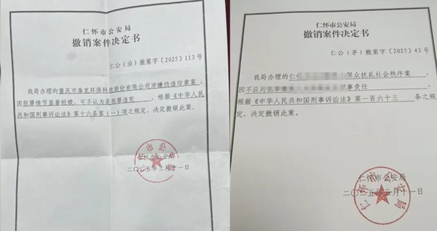 今年全国“两会”开幕前夕,笔者对该起“以刑抢劫”事件予以深度披露后,贵州省领导极为重视。2025年3月11日,仁怀警方同时撤销了重庆泰克“涉嫌伪造印章”案和泰克贵州子公司员工“涉嫌聚众扰乱社会秩序”案两起刑事案件。